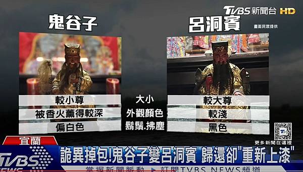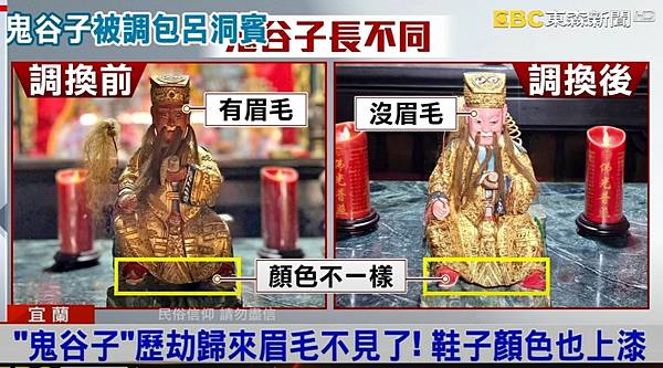 宜蘭市城隍廟發生一起神像調包離奇事件,原本供奉在城隍夫人殿的王禪老祖(鬼谷子)神像,廟方昨天(11日)下午發現竟變成「呂洞賓」神像,事件曝光後,今早廟方發現鬼谷子被放置在廟門前,但神尊外觀似乎重新被上漆。民俗專家廖大乙表示,鬼谷子是相命仙,測數字比較準,有可能是民眾想簽注樂透,才想把鬼谷子請回家拜拜。