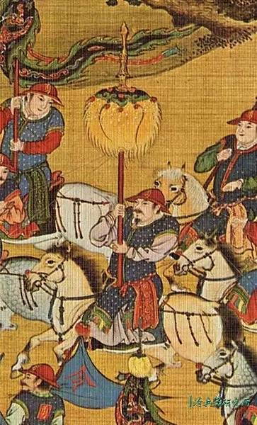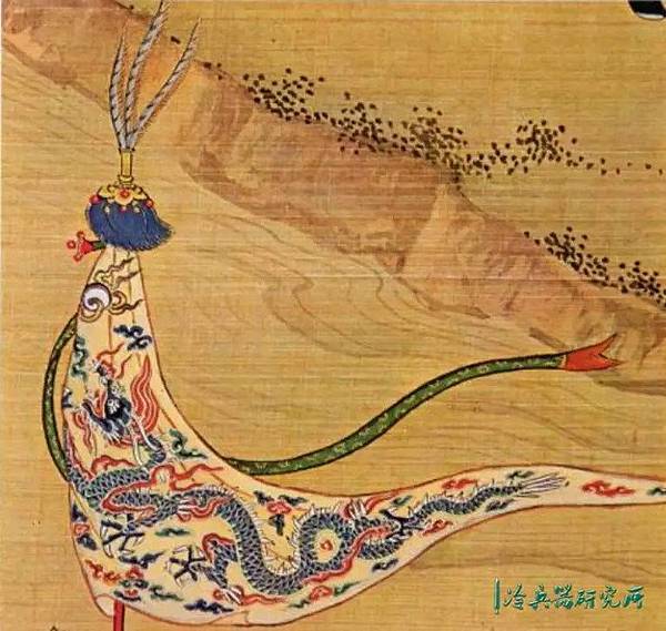 纛:纛是中國古代等級最高的旗幟,因此也有著旗頭之名。由於纛的地位之高,因此它常常出現在君王的儀仗隊之中,纛體稱為纛旓,旓就是我們經常在一些古代軍事題材的圖卷中看到的,旗杆上部的大毛球。正式的纛要用純色氂牛尾製成,因其多為皁色(黑)又稱皁纛,關於黑色氂牛尾的皁纛來歷,說起來格外可怕和神聖,因為最開始的纛是「兵主」蚩尤的頭髮!根據馬王堆三號墓出帛書《黃帝十六經 正亂》記載「剝下蚩尤的皮製成箭靶,……剪下他的頭髮來裝飾旗杆,並將這種旗子高高的懸掛,標之為「蚩尤旗」。