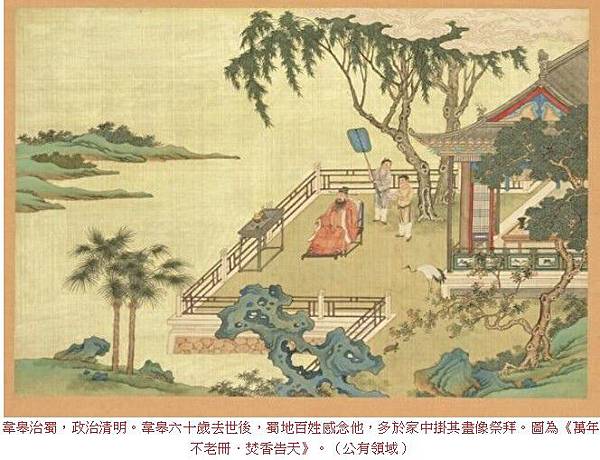 唐朝名臣韋皋字成武,京兆萬年人。貞元初(公元785年)德宗皇帝命韋皋為劍南西川節度使,以幫助西南地區解決民族矛盾紛爭。韋皋治蜀,政治清明。韋皋六十歲去世後,蜀地百姓感念他,多於家中掛其畫像祭拜。