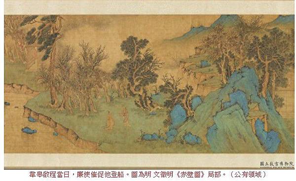 韋皋啟程當日,廉使催促他登船。圖為明 文徵明《赤壁圖》局部。(公有領域)