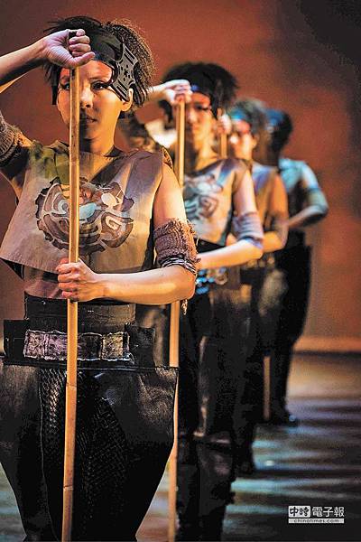 擊樂劇場《木蘭》裡,音樂家們拋下熟悉的琴槌鼓棒,拿著少林齊眉棍展現作戰情境,挑戰自我身體極限。(擊樂文教基金會提供)