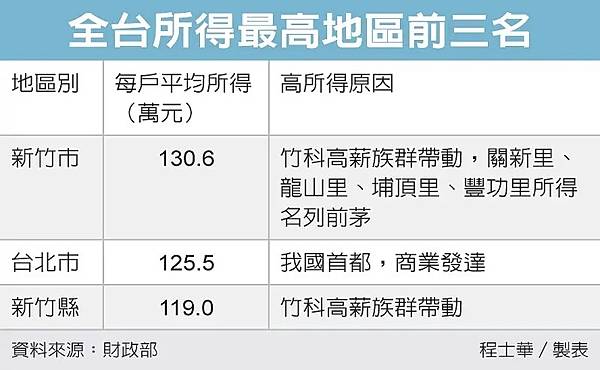根據財政部最新出爐的「112年度綜合所得稅申報初步核定統計專冊」,綜合所得總額平均數以新竹市152.4萬元續居全台之首,新竹縣以135.3萬元排名第2,台北市128.7萬元排名第3。