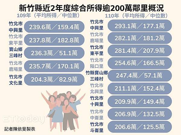 一○四年度所得總額中位數村里排名,第二名是竹縣竹北東平里一八三萬,第三是竹縣竹北鹿場里一七七萬,前十四名有六個在竹市東區、八個在竹縣竹北,都屬新興重劃區。第十五名才開始「非新竹」,是北市內湖寶湖里。