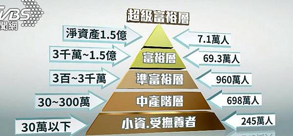 淨資產1.5億台幣的「超級富裕層」有7.1萬人、3千萬到1.5億的「富裕層」有69.3萬人、3百到3千萬的「準富裕層」960萬人,30到300萬的中產階層有698萬人,資產30萬以下的245萬人。台灣有錢人好多!「準富裕層」有960萬人 你符合條件嗎? https://bit.ly/42FR5sx