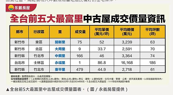 至於,該年度最富有里、新竹市關新里過去兩年半共揭露75件、平均總價3239萬元、平均坪數約63坪、每坪揭露均價約52萬元。全國最富有里 匯聚竹科高階主管目前最富有里待售住宅屋齡多半落在10至15年,大坪數住宅每坪均價約50至60萬元,20坪以下的小宅每坪均價則落在60至70萬元。再觀察竹北市「中興里」、竹北市「東平里」,兩個里僅有一路之隔,永義房屋竹北高鐵京宸加盟店協理謝孟涓表示,受到竹科發展影響,竹北市是少數鄰近竹科屋齡在10年內的重劃區,而且擁有高鐵站、河岸景觀、多個公園,受到許多年輕的竹科主管青睞。2022年前5名富有里 購屋偏好大坪數與高總價 - 自由財經 https://bit.ly/4dBAMAP