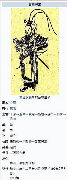 呂布(?-199年2月7日)[1],字奉先,并州五原郡九原(今內蒙古包頭九原區[註 1])人,東漢末年著名武將與軍閥。先後為丁原、董卓的部將,也曾為袁紹效力,後乘劉備與袁術交戰時而占據徐州,自成一方勢力。建安三年(公元199年)在下邳被曹操擊敗並處死。呂布 - 維基百科,自由的百科全書 - https://goo.gl/CQ15Hw