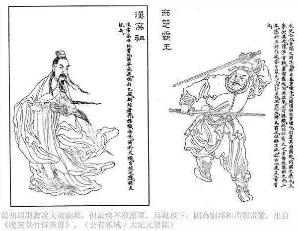 最初項羽數次大敗劉邦,但最終不敵漢軍,兵敗垓下。圖為劉邦和項羽畫像,出自《晩笑堂竹莊畫傳》。(公有領域/大紀元製圖)