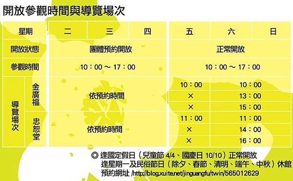 團體預約參觀開放時間為每日上午9點至12點、下午1點半至4點半,