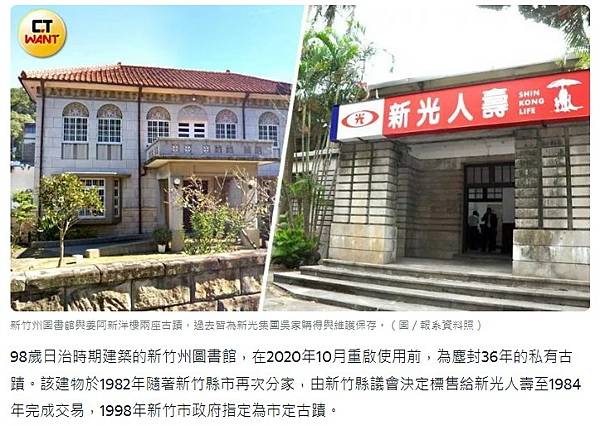 98歲日治時期建築的新竹州圖書館,在2020年10月重啟使用前,為塵封36年的私有古蹟。該建物於1982年隨著新竹縣市再次分家,由新竹縣議會決定標售給新光人壽至1984年完成交易,1998年新竹市政府指定為市定古蹟。