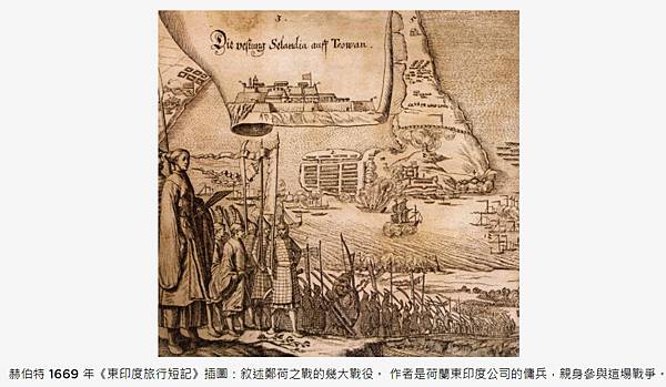 赫伯特 1669 年《東印度旅行短記》插圖:敘述鄭荷之戰的幾大戰役。 作者是荷蘭東印度公司的傭兵,親身參與這場戰爭。