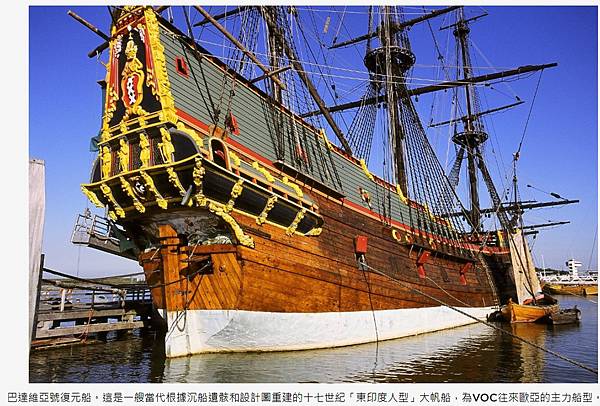 巴達維亞號復元船。這是一艘當代根據沉船遺骸和設計圖重建的十七世紀「東印度人型」大帆船,為VOC往來歐亞的主力船型。