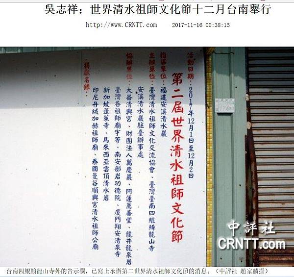 他指出,第2屆世界清水祖師文化節訂12月1、2日兩天將在台南舉行,有兩場國際清水祖師文化學術研討會將邀請兩岸學者及清水祖師廟代表提出論文及專題報告,深度探討清水祖師信仰文化的源流與影響。其次,還將邀請海內外與會者,參訪台南保安宮傳統廟會“普渡”、“宴王”,體驗台南的傳統民間信仰文化。