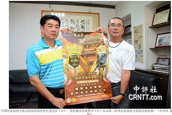 台灣清水祖師文化交流協會創會會長吳志祥(右)、協會秘書長陳世川(左)出示第二世界清水祖師文化節活動海報。(中評社 趙家麟攝)