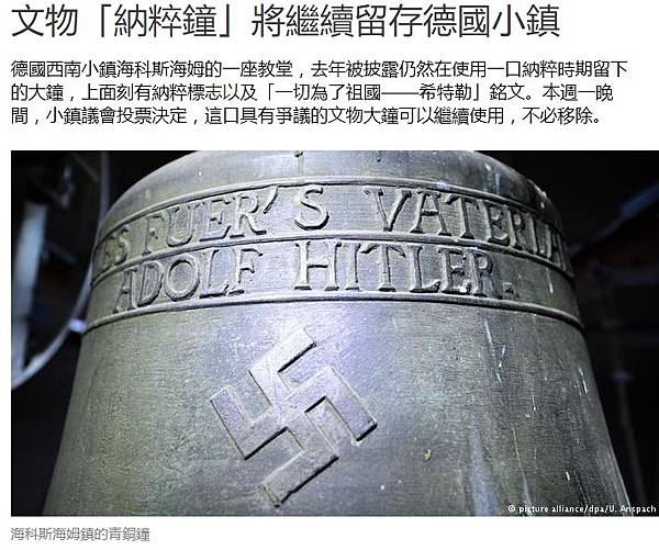 德國西南小鎮海科斯海姆的一座教堂,去年被披露仍然在使用一口納粹時期留下的大鐘,上面刻有納粹標志以及「一切為了祖國——希特勒」銘文。本週一晚間,小鎮議會投票決定,這口具有爭議的文物大鐘可以繼續使用,不必移除。