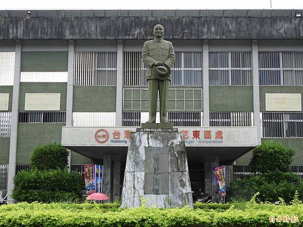經濟部台糖公司轄下花蓮光復糖廠公共空間有一尊大型蔣公銅像,目前尚未處置,遊客出入糖廠園區可以看見銅像。(記者陳鈺馥攝)