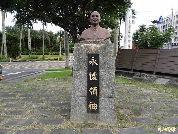 全台地方政府所轄威權象徵數量967處,目前已處置297處、占31%,其中花蓮縣有22處,僅處置8處。圖為花蓮新城鄉公所前,尚未處置的蔣公銅像。(記者陳鈺馥攝)