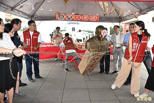 台灣基進黨在自由廣場前舉行「2023台灣大普渡,祭台灣英靈 紱中國邪氣」,黨主席王興煥帶領黨員一同用鐵鍊拉倒象徵威權的蔣介石銅像。(記者田裕華攝)2023/09/07 18:59