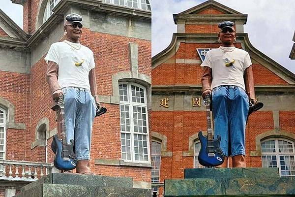 建中學生昨日開始布置蔣介石銅像,有網友拍下照片上傳到社群平台後引發熱議,只見圖中的蔣介石頭戴貝雷帽、眼戴墨鏡,穿著黏有香蕉的白色上衣以及一件淺藍色牛仔褲,右手並拿著一把電吉他。貼文一出馬上就有人指出這是建中每年都有的傳統,許多網友也大讚學生有創意。