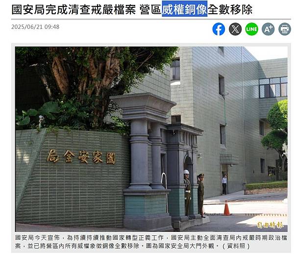 國安局完成清查戒嚴檔案 營區威權銅像全數移除 - 自由軍武頻道 https://bit.ly/4e9rFcm