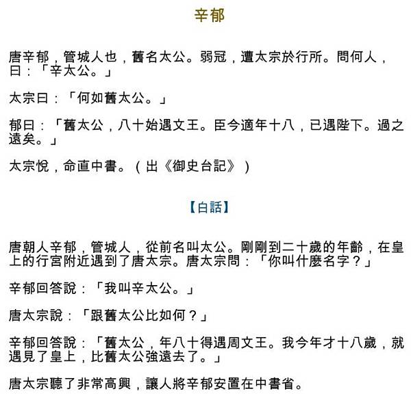 唐太宗李世民見一位年輕、儀表端莊的臣子,認為頗為不凡,就問他是何姓名?年輕的臣子跪下奏道:「臣名辛太公」。