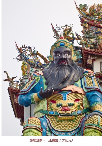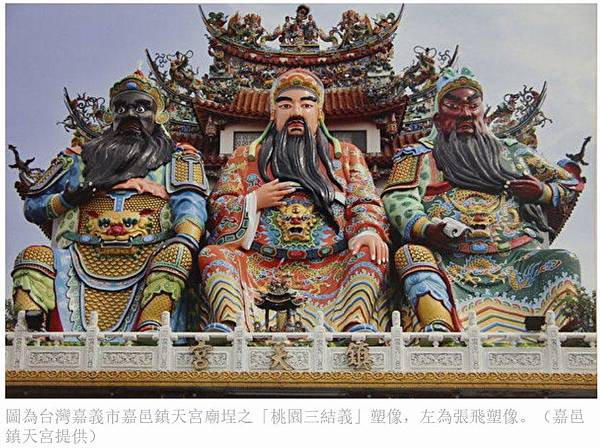 圖為台灣嘉義市嘉邑鎮天宮廟埕之「桃園三結義」塑像,左為張飛塑像。(嘉邑鎮天宮提供)
