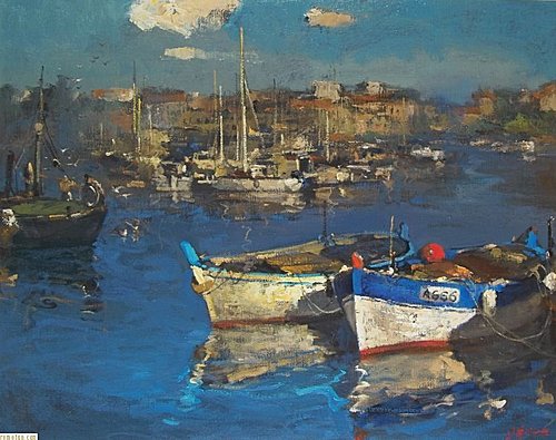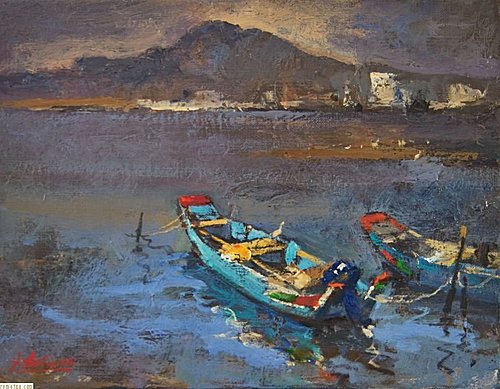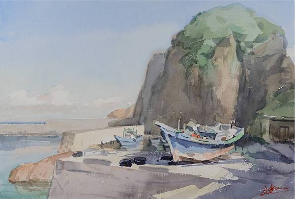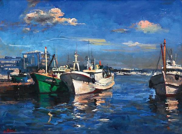 漁村的成長背景,使畫家對「漁船」有一份眷戀,本作以停泊的竹筏為題描繪了沿海居民的生活情調與遊子對故鄉的思念之情。