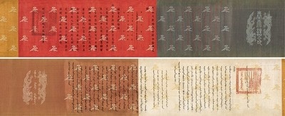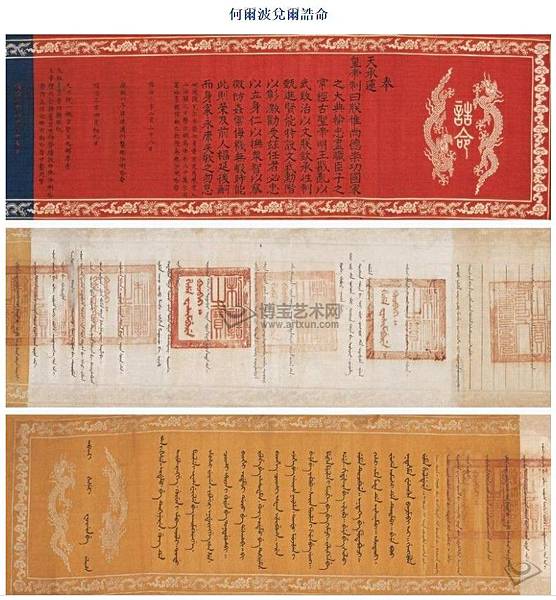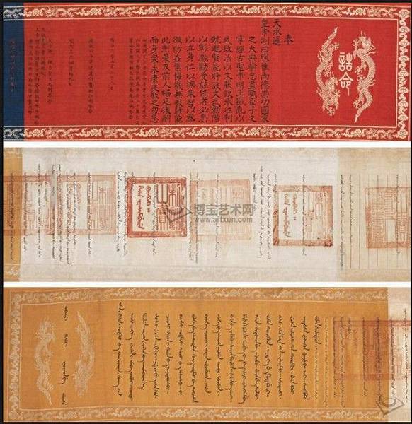 鈐印:制誥之寶清順治二年(1645)至乾隆三十五年(1770)手寫本1卷織錦提要:全卷織繡雲龍及首尾文字,中間文字手書。封授何爾波兌爾世襲誥封。順治二年始封授,順治三年何爾波兌爾病故,以子拜達爾承襲,順治七年晉升為“拜他喇布勒哈番”。順治十五年拜達爾病故,仍由其子世襲。康熙二十二年傳襲。至乾隆十八年,世襲人常保病故,其侄雙德承襲雲騎尉。乾隆三十二年,雙德病故,其子全德繼襲。乾隆三十五年,全德病故其子德倫承襲。此皇封誥命反映了清王朝的世襲制度,承襲記錄長達一個世紀之久,為清代早期皇室誥命之稀見之本。滿漢文字。該品曾參拍2006年紐約蘇富比秋季拍賣會。30×420cm
