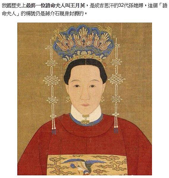 我國歷史上最終一位誥命夫人叫王月英,是成吉思汗的32代孫媳婦,這個「誥命夫人」的稱號仍是蔣介石親身封爵的。