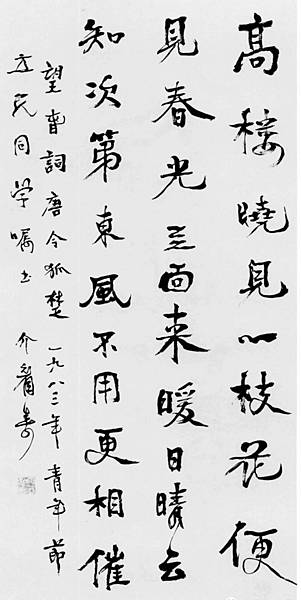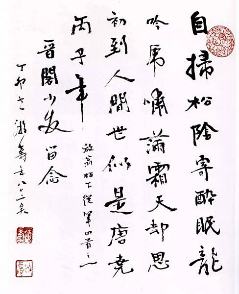 由於我是治先秦文獻,接觸金石資料,又曾校理二處收藏相當多的金石拓本,多閱些名家書筆法。我的老師輩,胡小石、吳瞿庵、汪辟疆,我都精心看他們的寫字,當然胡老師作書的磅礴之氣給我啟發最多。而在我進中學時,看老父親寫壽序,舊時經師醇篤景象,打下我的書學基礎。因之在大學時,雖字寫不好,一位老經師理學家(王伯沆,周法高岳父)謂我力學,自適名家。現在已是風燭殘年,這許多往事,正自愧無成,卻來相問,實在無以對。