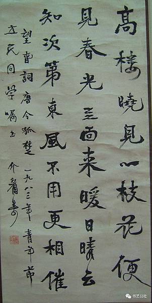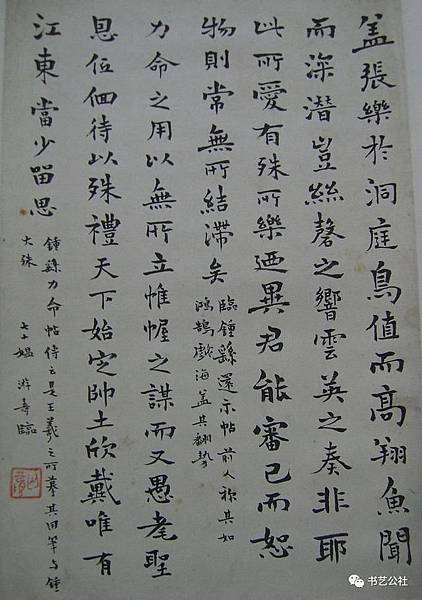 對於學書,卻有新的體會,寫字必定從幼孩學起,因為他天資乾淨,沒有受庸俗干擾,從他執筆開始,坐着端正,緊握五指,以三指為正,後兩指支撐,給他們看端正好字范。到他們會執筆,給他們懸腕寫寸楷,以隋妙楷,或初唐諸名家,上至鍾、王,這樣他們眼中有上乘書法的基礎,以後篆、隸、行、草,隨他們年齒學習前進,當然書法可觀。即使作為交際工具,字也能寫得端正流美,給人以快感,千萬不能教十二三歲小孩寫草書,而又亂吹捧什麼「小書法家」。尤以當父母師長,把兒童作為四方招搖的「奇貨」,實是有失體統。我是中材下愚之人,我體會是這樣的。