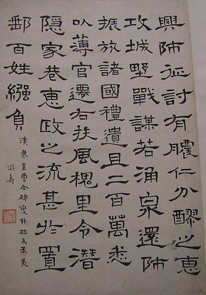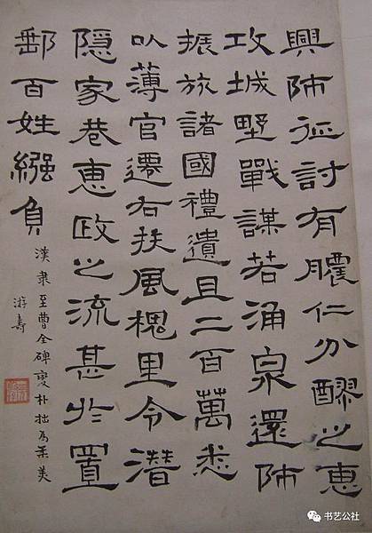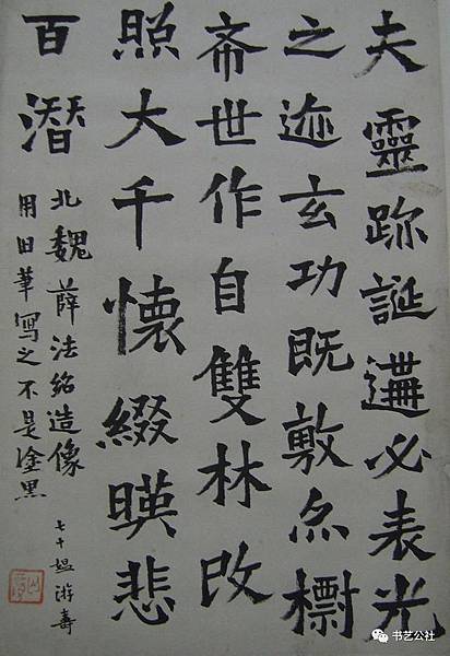一切學習,都當從正確入手,求「取法上乘」。我曾學顏書,後來學大篆(寫鐘鼎文字)、漢隸,着重學《韓勑》(禮器)、參《倉頡廟》和《流沙墜簡》,行書曾寫黃山谷,後來感到草野,又學鍾繇諸表,雖非原來之跡,但漢人韻味,非唐、宋人之工巧可比。楷書(真書、今隸異名,實為一),對《張猛龍》、《張黑女(張玄)》下一點功,由於流俗都寫顏,我決心學北魏,以變顏的熟。