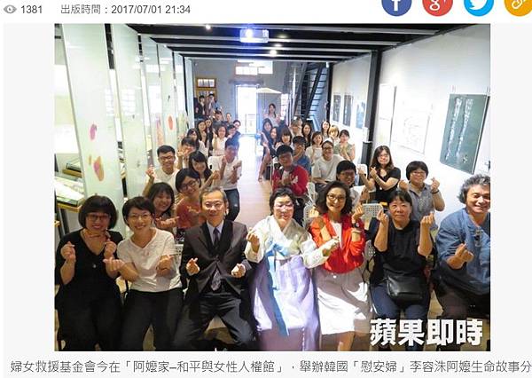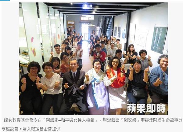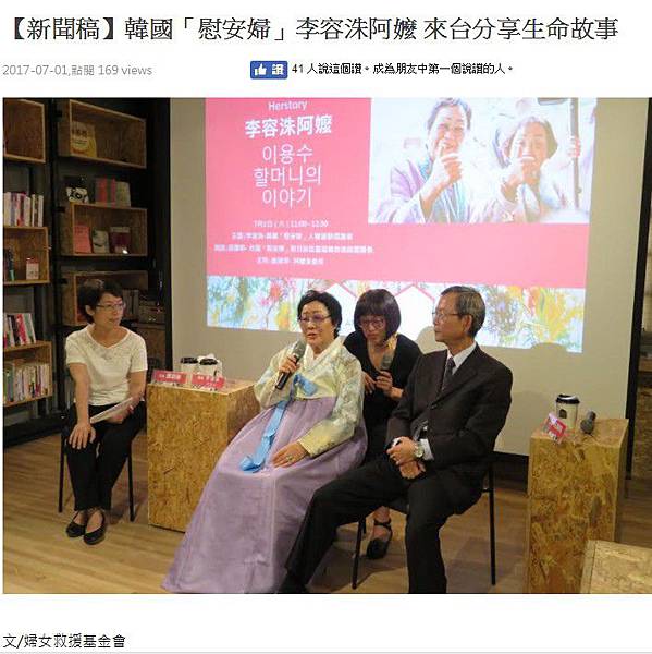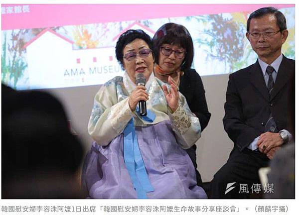 今日(7/1)慰安婦紀念館「阿嬤家」舉辦座談,邀請韓國慰安婦倖存者李容洙、台灣慰安婦對日訴訟義務律師團團長莊國明到場與談,李容洙除了訴說被強徵為日軍慰安婦和投入慰安婦人權運動的生命歷程,也向今年(2017)4月逝世的台籍慰安婦陳蓮花阿嬤致哀,呼籲日本政府向僅存的慰安婦誠懇道歉。