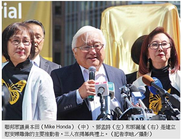 聯邦眾議員本田(Mike Honda)(中)、鄧孟詩(左)和郭麗蓮(右)是建立慰安婦雕像的主要推動者,三人在揭幕典禮上。(記者李晗/攝影)