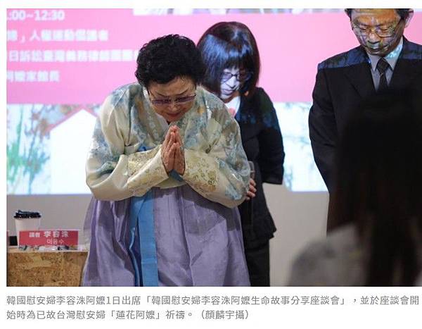在座談會一開始,李容洙先起身為4月剛逝去的台灣慰安婦「蓮花阿嬤」陳蓮花哀悼,李容洙表示她去年才與蓮花阿嬤見過面,如今卻要面對蓮花阿嬤的逝去。李容洙說,有那麼多的奶奶都遭遇「慰安婦」這麼痛苦的經歷,而倖存者一一離開人世,希望韓國、台灣等亞洲國家能快點解決「慰安婦」問題,還給她們尊嚴。