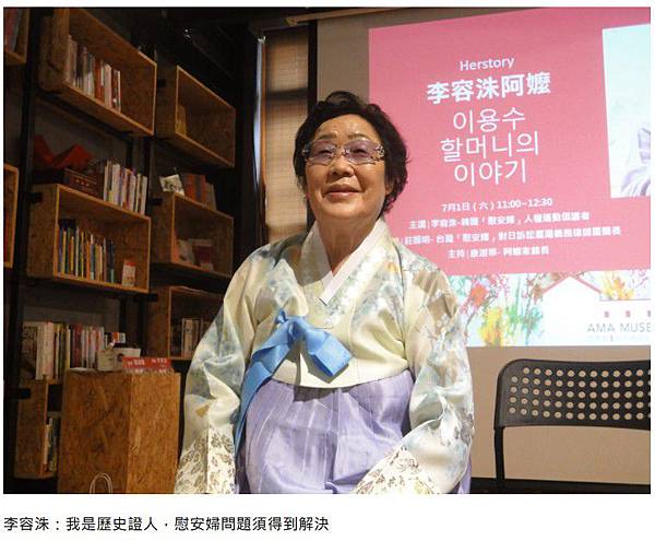 李容洙表示,她15歲時在不知情的情況下被日軍強制拉去當慰安婦,來到台灣新竹的慰安所後淪為日軍的性奴隸,在受害的日子裡她因拒絕進入日軍的房間,而遭到刀刑和電擊虐待。李容洙含淚說,這段身為慰安婦的經歷令她感到很痛苦、悲傷,卻從未得到日本政府誠懇的道歉,她強調「我是歷史的證人,我要活到200歲,一定要等到日本道歉。」