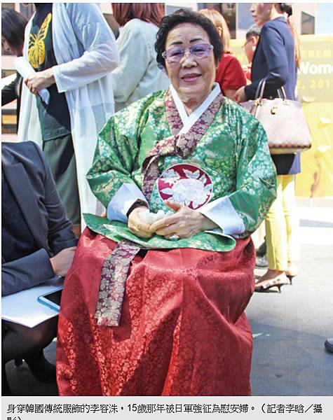 身穿韓國傳統服飾的李容洙,15歲那年被日軍強征為慰安婦。(記者李晗/攝影)