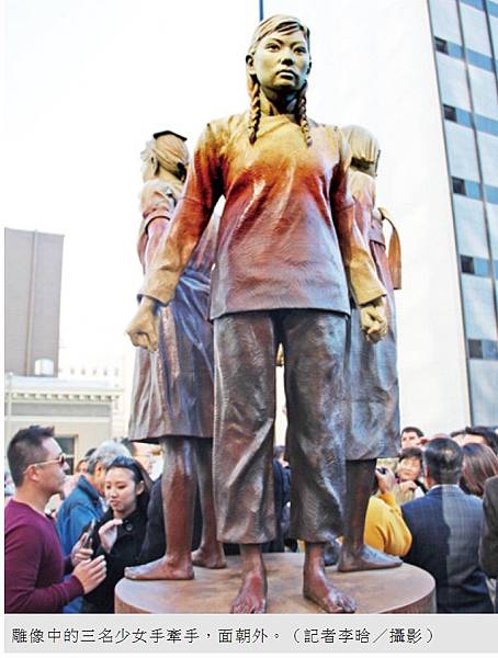 這組塑像包括一尊以首位公開講述個人經歷的韓國“慰安婦”金學順為原型的塑像,和一尊中國、韓國和菲律賓三名“慰安婦”少女手拉手的塑像,均為真人大小。