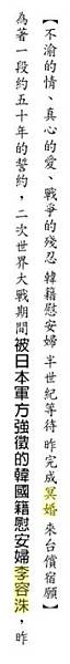2004年12月在四天內舉行,“全國12-4同期舉辦”不可磨滅的記憶。“在”1944年,16歲被送到時,台灣“穿著像禮服軍裝男人”。其中上移船,多次被日本兵強姦是。在台灣,一個日軍“慰安婦”的生活了三年已被迫。造成很多人還士兵對方在一天的“慰安所”,而電阻或擺脫當前的,如電線,已被引入,它已經收到了攻擊或在日誌中挖掘“ [45]。