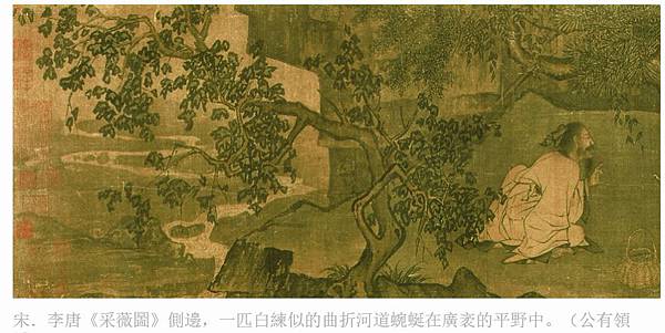 宋.李唐《采薇圖》側邊,一匹白練似的曲折河道蜿蜒在廣袤的平野中。(公有領域)