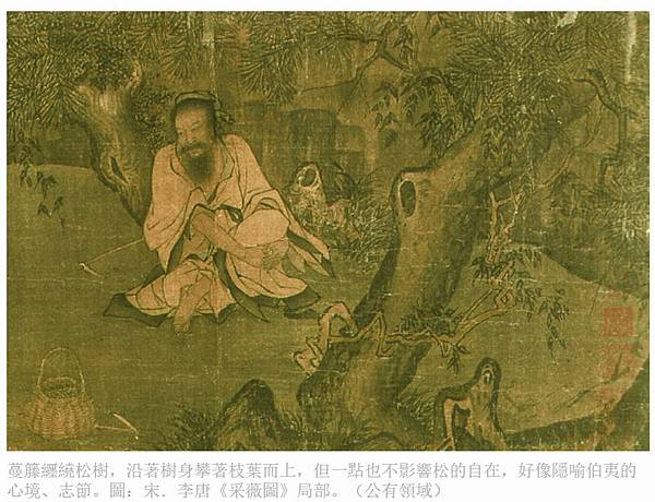 蔓籐纒繞松樹,沿著樹身攀著枝葉而上,但一點也不影響松的自在,好像隱喻伯夷的心境、志節。圖:宋.李唐《采薇圖》局部。(公有領域)