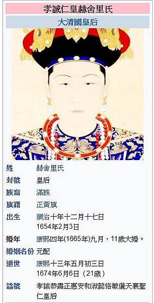 輔政大臣一等果毅公遏必隆女,鰲拜義女。初為妃,康熙十六年八月冊立為後。一直覺得這個女人挺委屈的,以她的身份高貴,卻不得不屈居在赫捨裡氏之下。但鈕祜祿氏並沒有就此認命,她的努力她的不平凡注定不會使她一輩子屈居人下。康熙十六年八月二十二日,鈕祜祿氏正式成為康熙的第二任皇后,她對上孝敬太皇太后、皇太后,對下善待庶子,對待康熙更是賢良淑惠,竭盡妻子之能。早在康熙八年,康熙一舉清除鰲拜集團,遏必隆坐護惡不阻之罪,被削去太師銜及公爵。當年對於孝昭的優勢現在其實已然變成了不足,而她能夠在這樣的環境下封後,足以表明她與康熙之間的深厚感情也是不能小覷的。