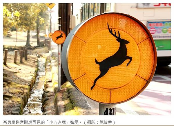 奈良車道旁隨處可見的「小心有鹿」警示。(攝影:陳怡秀)