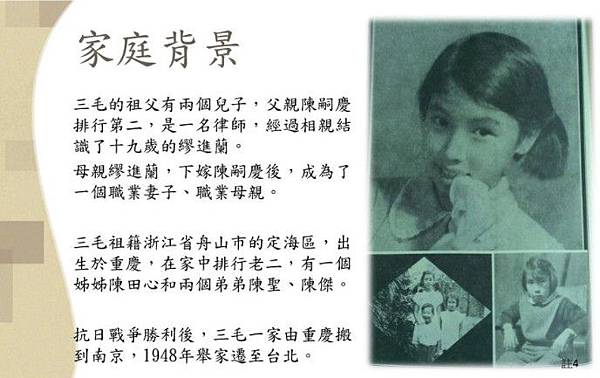 浙 江定海人,民國三十二年(一九四三)三月二十六日(癸未年二月二十一日,此據「皇冠出版社」版「三毛全集」附錄「三毛一生大事記」;張樂平「痛別三毛」作 一九四五年)生於四川重慶黃桷椏。父嗣慶(民二生於上海,復旦大學法律系畢業,長期執行律師職務),母繆進蘭。三毛行二,有一姊(田心)、一弟,自幼體弱 多病,孤僻善感,「小時候很獨立,也很冷淡,她不玩任何女孩子的遊戲,她也不跟別的孩子玩」(陳嗣慶「我家老二--三小姐」)。