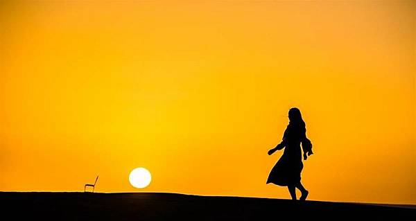 正是黃昏,落日將沙漠染成鮮血的紅色,淒豔恐怖。近乎初冬的氣候,在原本期待著炎熱烈日的心情下,大地化轉為一片詩意的蒼涼。