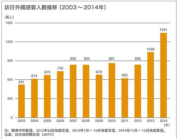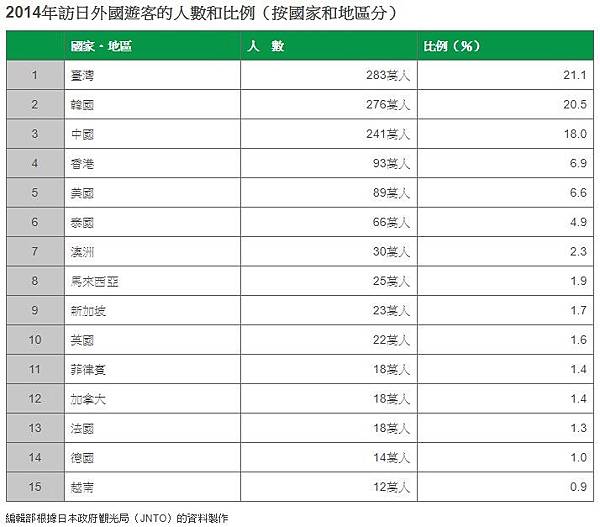 根據日本國土交通省觀光廳的推算統計,2014年訪日的外國遊客人數為1,341.36萬人,比上一年度成長29.4%,連續兩年刷新歷史最高紀錄。其中,來自亞洲地區的遊客為1,061萬人,占總體的79%。這裏面,來自東亞的遊客人數為892萬人,占總體的66.5%。從國家和地區來看,居首位的是臺灣,為282萬人;其次是韓國,為275萬人;第三位是中國,為240萬人;第四位是香港,為92萬人,第五位是美國,為89萬人。後面依次是泰國、澳洲、馬來西亞、新加坡和英國。