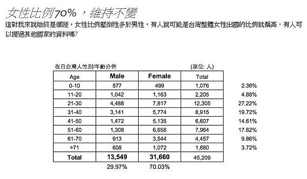 另外,在男女統計以及年齡分布部分,也可以明顯發現以選擇在日本生活來說,男女比例還是有大幅差異──年紀部分則大多分佈在20-40歲間,相對適於留學以及海外工作的年齡。