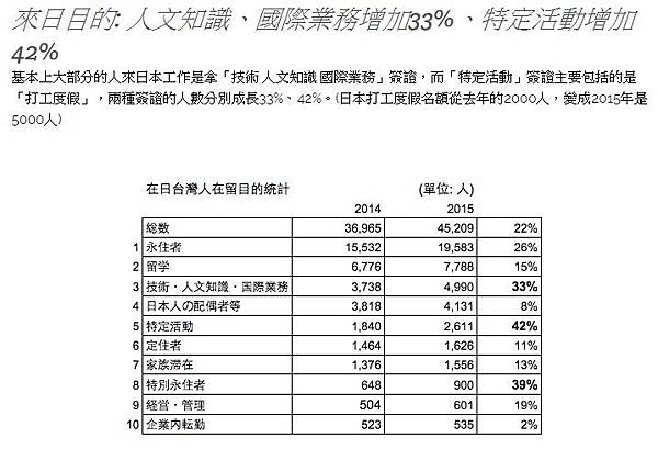 根據截至 2016 年底,我們的最新統計指出,在日台灣人總數已超過 5 萬人,年增率約達 38%──其中持工作簽證者年年增高,打工度假也因法規開放,與 2014 年相比增加約 2.5 倍,而持留學簽證者,增加率則相對較不明顯。