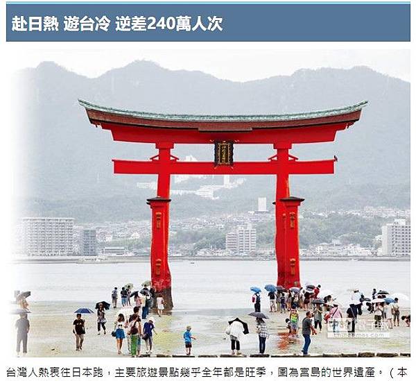 台灣力拚日人來台觀光旅遊,交通部觀光局希望2020年達到台、日旅客互訪達到700萬人次、甚至800萬人次。不過,以目前台灣人熱衷往日本跑的現象來看,幾乎全年都是旺季,可能會使台日旅客互訪的「逆差」更加擴大。