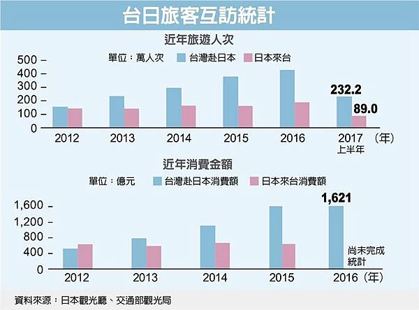 台灣民眾超愛日本,據交通部觀光局統計,去(2016)年我前往日本多達429.5萬人次,遠多於日本民眾來台的189.6萬人次,財團法人商業發展研究院估算,台灣民眾赴日本人數遠多於日本旅客來台,台日觀光逆差高達近千億元。