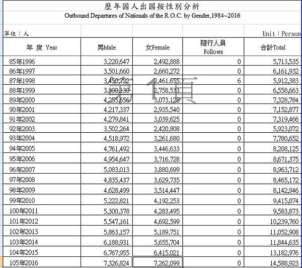 根據立法院預算中心專題報告指出,國人出國風氣日盛,去年國人出國總人次1458萬左右,平均每人出國0.62次;國人出國旅遊以去日本最多,人數逐年增加,去年赴日旅客達約430萬人,而日本來台旅客約190萬人,雙方人數差異也逐年增加。